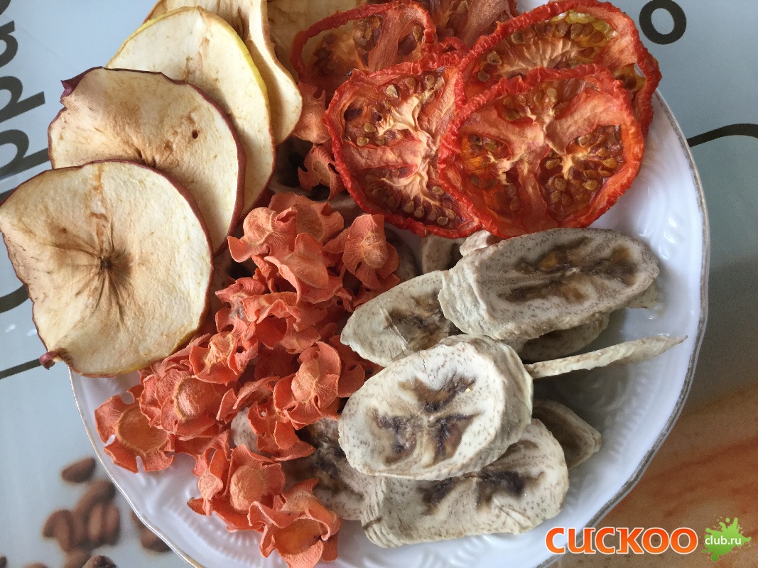 Насушила немножко, то , что было дома. ( помидоры, банан, яблоко, апельсин, морковка) Не терпелось проверить Волтеру в работе.