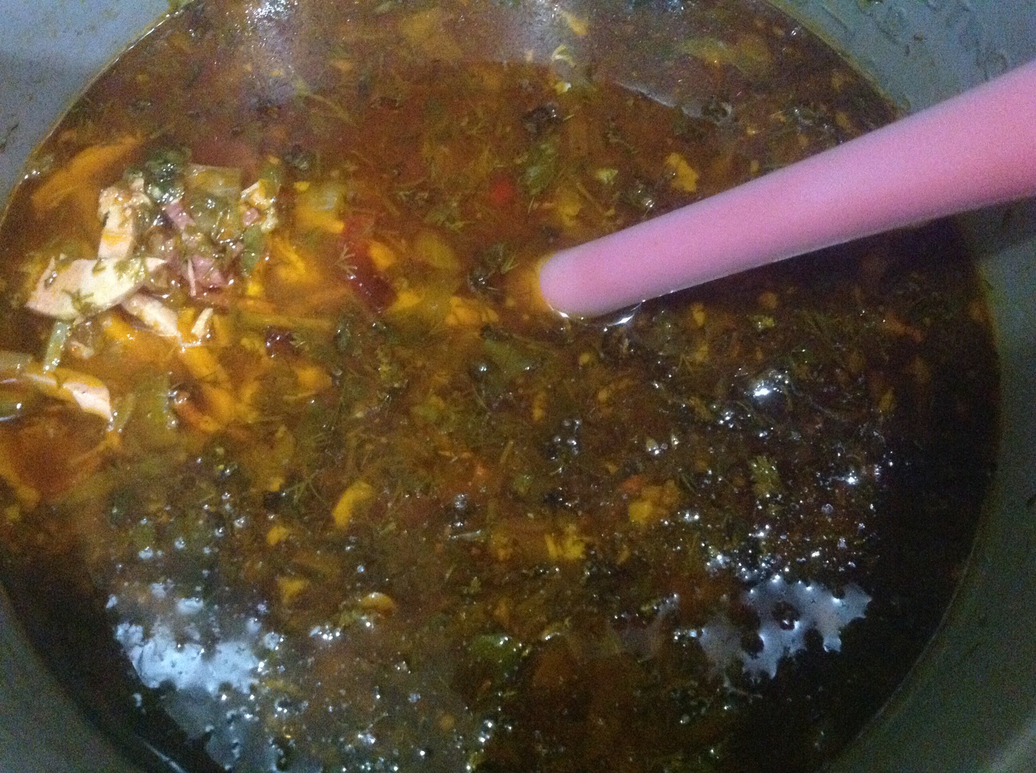 Мясо отделяем от костей, нарезаем и возвращаем в бульон.