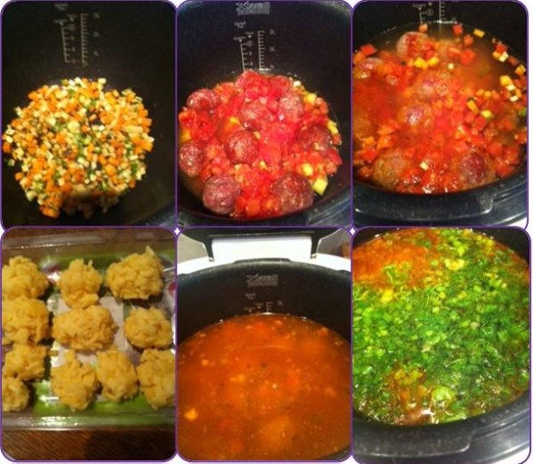 По истечению приготовления супчика, открыть крышку добавить кипяток, сырные шарики, зелень и выствить режим «Разогревание»(дважды нажав кнопку подогрев-разогрев), появится время 9 минут. По истечению времени, добавить еще измельченной свежей зелени и все наш супчик готов. Приятног аппетита!!! s35