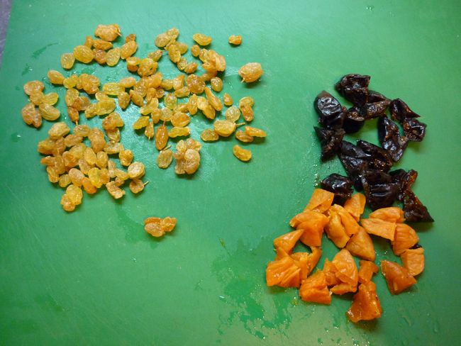 и готовим вторую партию. Пока готовится вторая партия, сливаем воду с фруктов, чернослив и курагу разрезаем на четыре части.