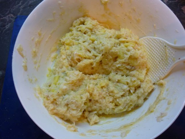 Затем смешиваем с картофельным пюре, добавляем яйца, масло, приправляем солью и перцем ( по желанию ).