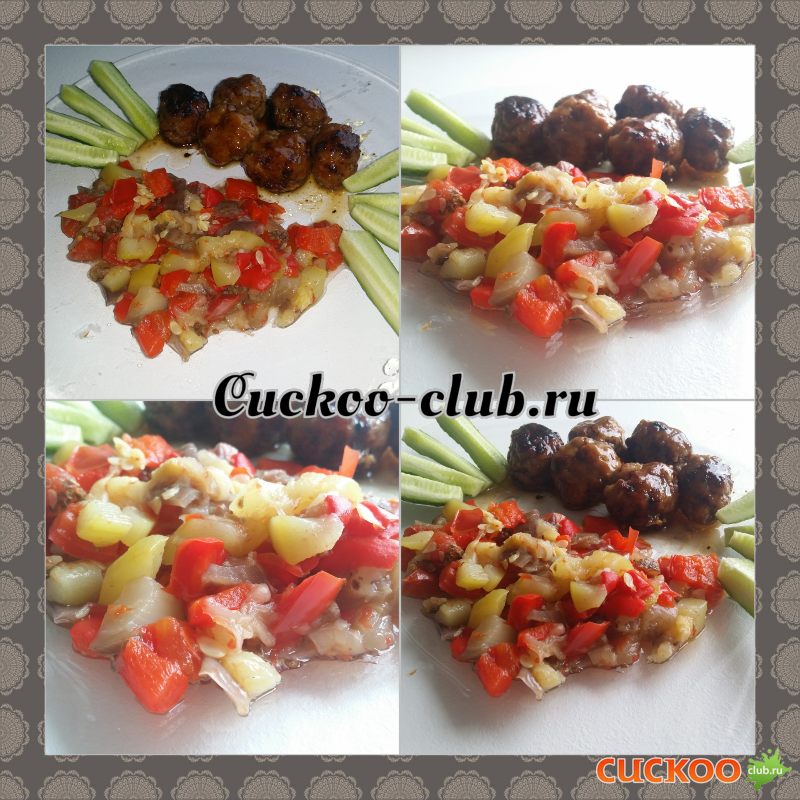 С кабачка и помидор снять шкуру, порезать все овлщи на любимый размер, уложить в чашу мультиварки, посолить. Воды я не добавляла. И режим ОВОЩИ. Правда он мне показался очень коротким. И я еще раз потом включила его же. Но где-то на середине цикла принудительно отключила программу. Выдавила чеснок, перемешала и на гарнир к своим тефтелькам а13 Рецепт тефтелек тут