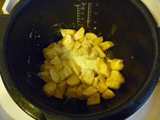 Открываем крышку и выкладываем картофель в чашу мультиварки.