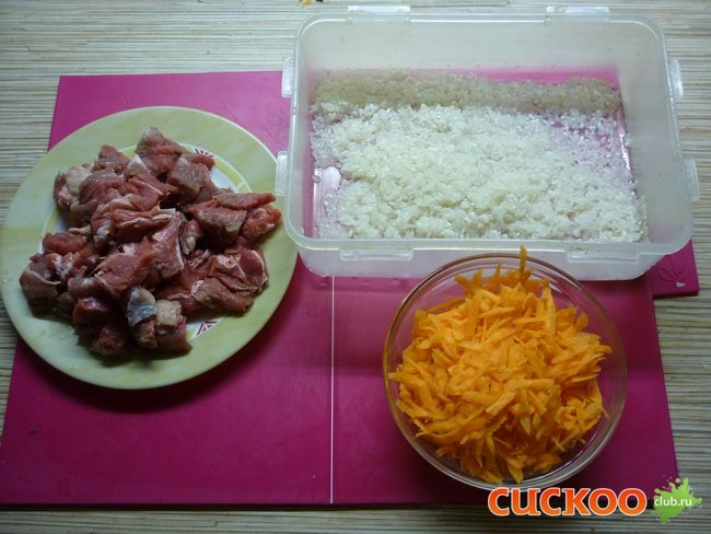 Мясо ( у меня говядина ), моем и нарезаем на кусочки. Рис тщательно промываем, морковь трем на крупной терке.