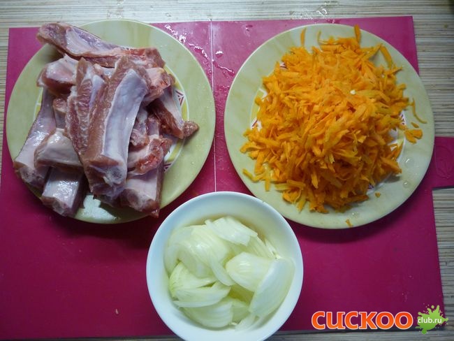Мясо моем и нарезаем. Лук режем полукольцами, морковь трем на крупной терке.