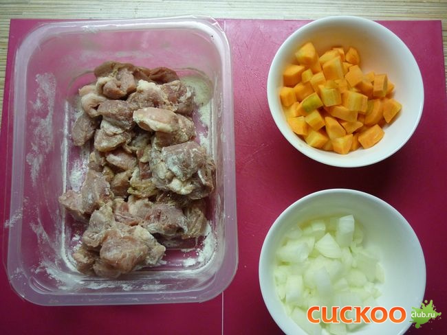 Мясо моем и нарезаем кусочками, солим, перчим и обваливаем в муке. Лук мелко нарезаем, морковь нарезаем квадратиками.