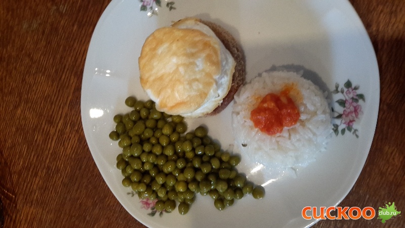 Из хлеба вырезать два кружка (я это делала спец. кольцом для салата) и подсушить, затем дно кастрюльку смазать маслом, установить кольцо и выкладываем взбитые белок, делаем углубление и выкладываем желток, сверху закрываем белком. Даем поджариться несколько минут и слегка поддев лопаткой переворачиваем и даем поджариться второй стороне. Все, наш а ля пашот готов. На тарелочку выкладываем кружок из хлеба, на него помещаем наше яичко ( хорошо бы листик зеленого салата, но у меня его не было) и все. Я еще добавила горстку риса и пару ложечек зеленого горошка. Угощайтесь мои дорогие. s35