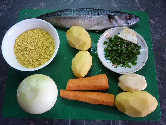 Рыбу моем, потрошим, разделываем как на филе и нарезаем кусочками. Пшено промываем, лук мелко режем.