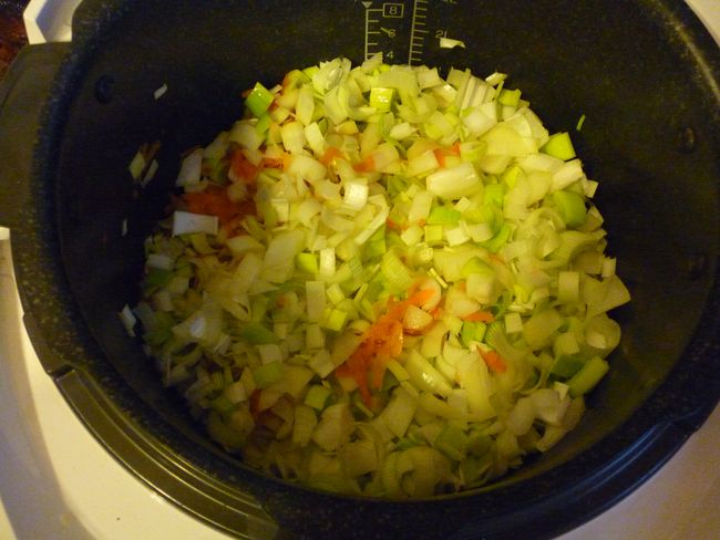 Закрываем крышку, поворачиваем ручку в положение “Закрыто”и выбираем программу “Мультиповар”. Устанавливаем время 35 минут и температуру 100 градусов. Нажимаем кнопку “Старт”. Пока готовится курица – нарезаем мелко репчатый лук, морковку трем на крупной терке.