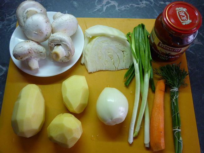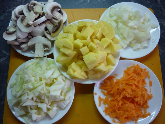 Капусту моем и шинкуем, морковь трем на крупной терке, грибы нарезаем произвольно, картофель режем кубиками, лук мелко нарезаем.