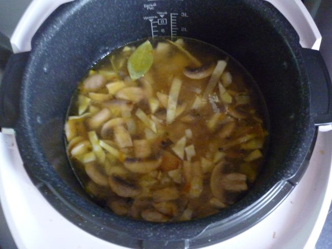 После сигнала добавляем картофель, заливаем один литр воды, солим, кладем лавровый лист, перец горошком и пару веточек гвоздики.