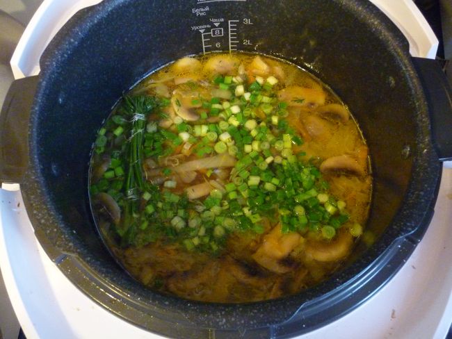 Закрываем крышку, ручку поворачиваем в положение “Закрыто” и выбираем программу “Суп”. Нажимаем кнопку “Старт” и ждем окончания программы. После сигнала, открываем крышку и добавляем томатную пасту и зелень.