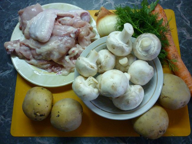 Картошку режем квадратиками, грибы моем, очищаем и так же нарезаем квадратиками.