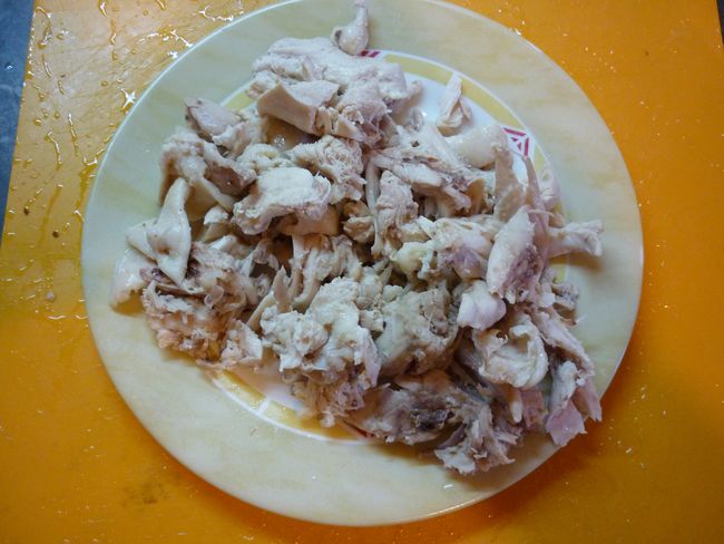 После сигнала, курицу вынимаем, охлаждаем и отделяем мясо от костей, бульон процеживаем.