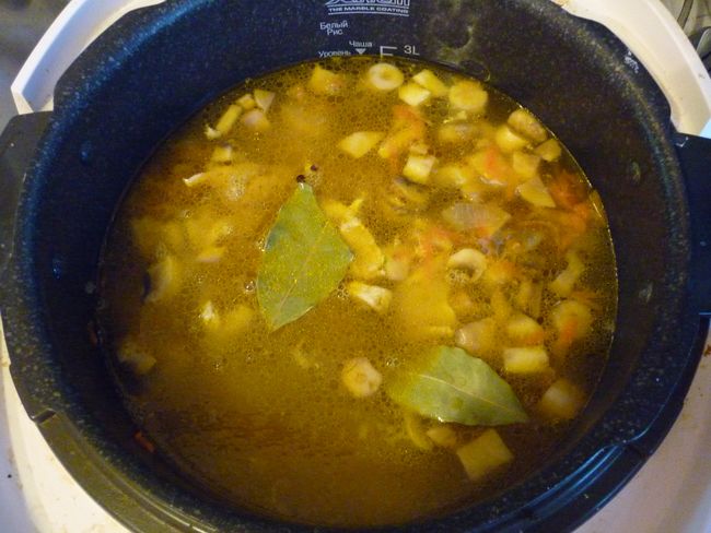 После сигнала добавляем картофель, мясо курицы, лавровый лист, перец горошком и две веточки гвоздики, наливаем бульон, добавляем воды до отметки 3 литра, солим.