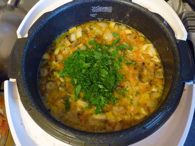 Закрываем крышку, поворачиваем ручку в положение Закрыто и выбираем программу “Суп”. Нажимаем кнопку “Старт”. Ждем окончания программы. После сигнала, открываем крышку и добавляем зелень.