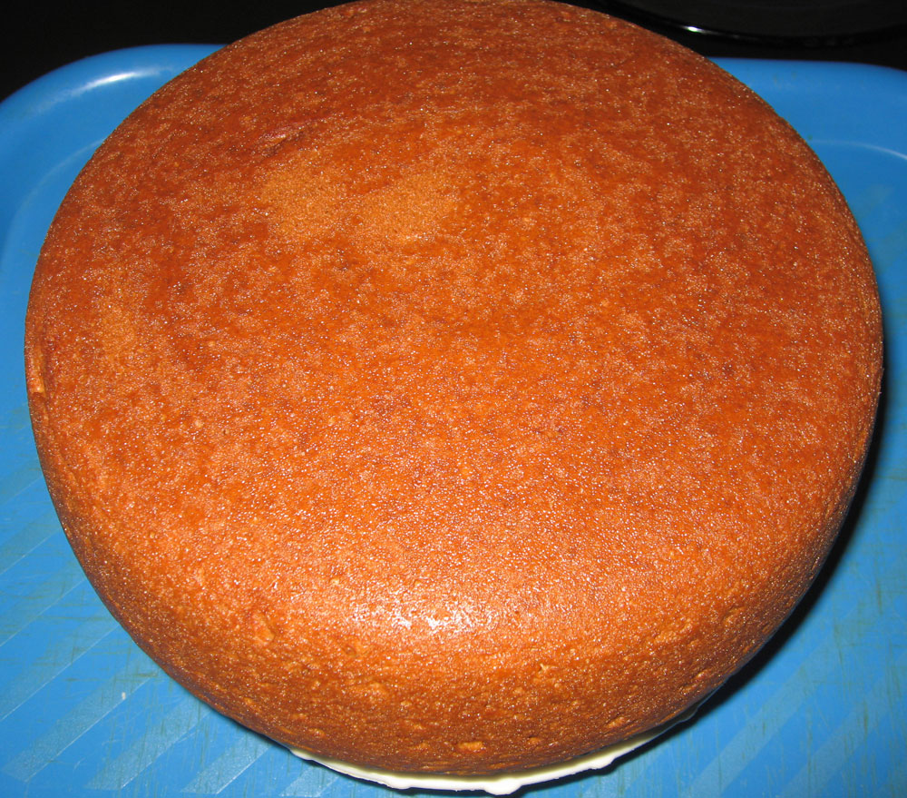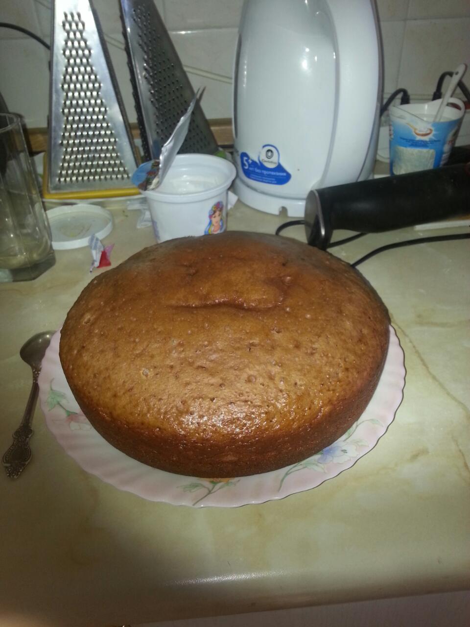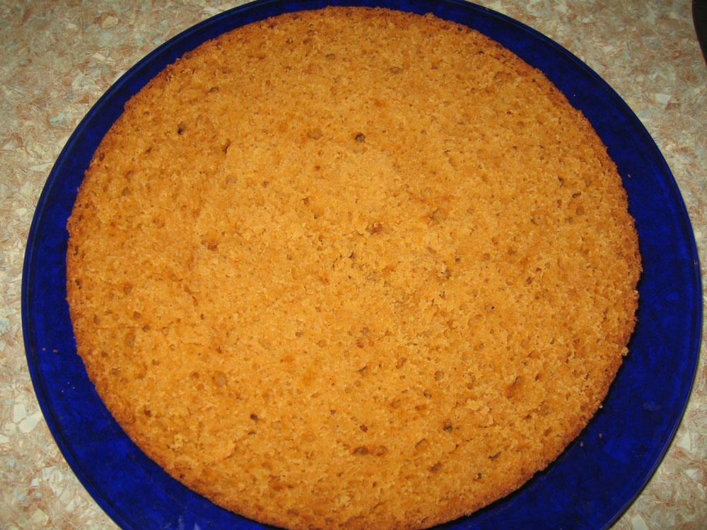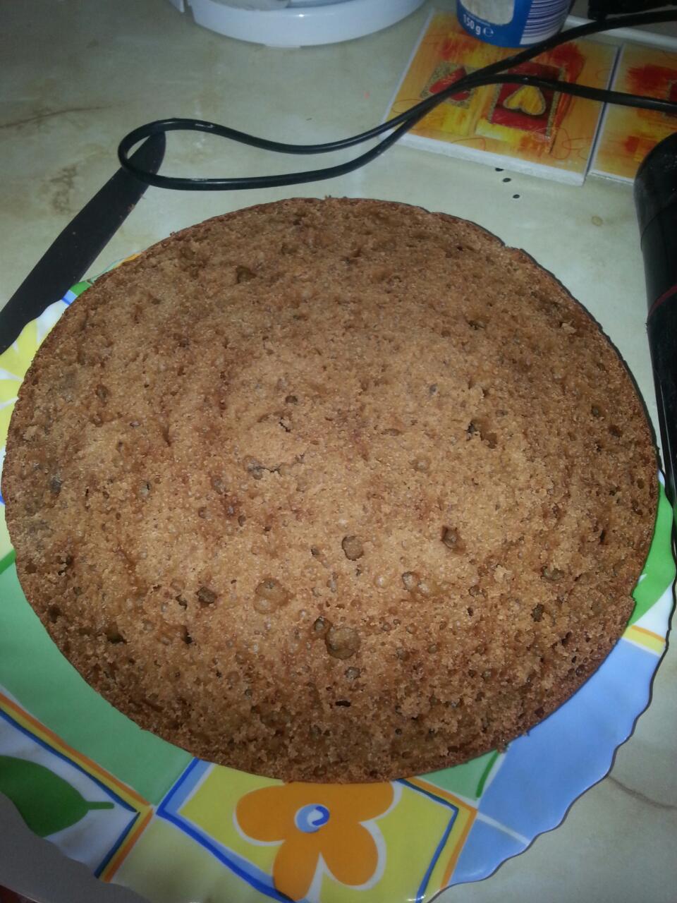 Дать остыть, разрезать на три коржа (если очень постараться может разрежется и на 4).