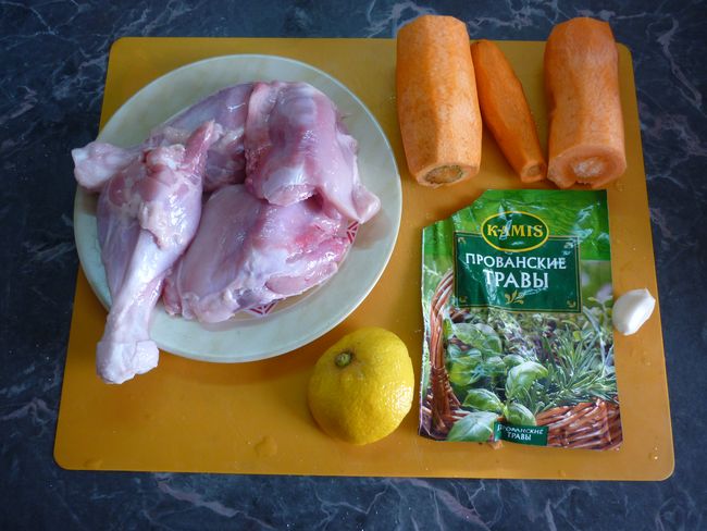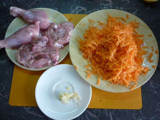 Курицу моем, солим и добавляем специи. Я добавил “Прованские травы”. Морковь нарезаем соломкой или трем на крупной терке. Чеснок давим давилкой или натираем на мелкой терке.