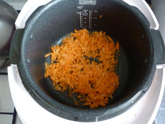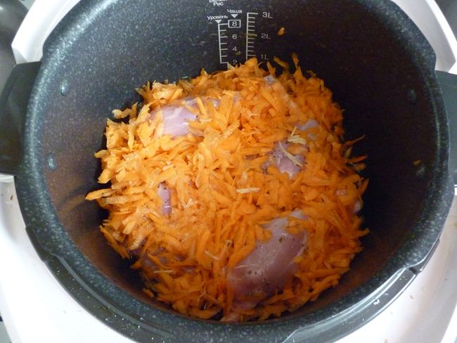 Открываем крышку мультиварки и выкладываем половину морковки.