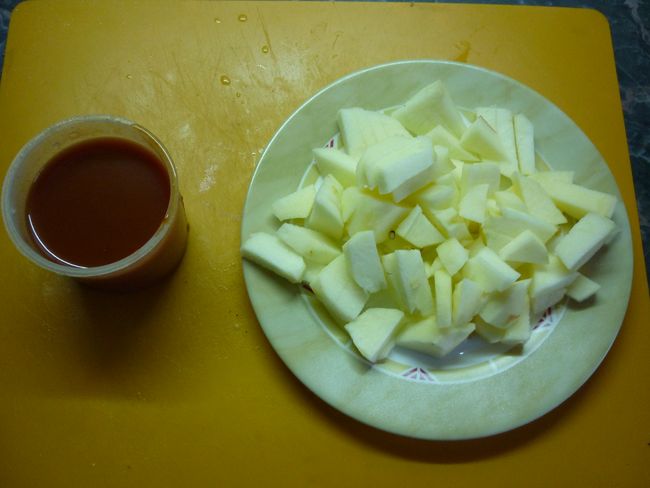 Яблоки нарезаем квадратиками, томатную пасту разводим в одном мульти стакане воды.