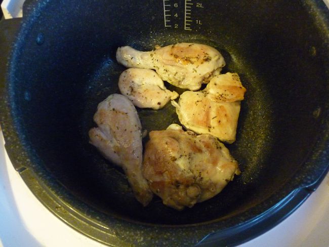 PS – Хотите еще вкуснее? Пока жарится курица, нарезаем мелко репчатый лук. Выкладываем куски курицы, после жарки, в отдельную посуду. В чашу выкладываем нарезанный лук и поджариваем на режиме “Поджарка”. Время 5-8 минут и второй уровень температуры. Не забываем помешивать.