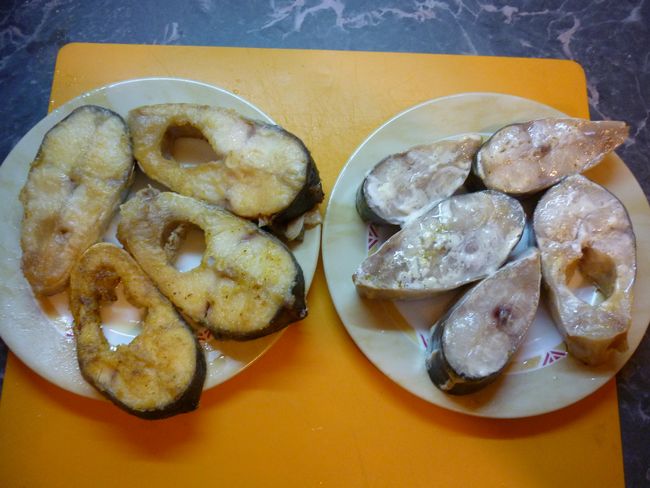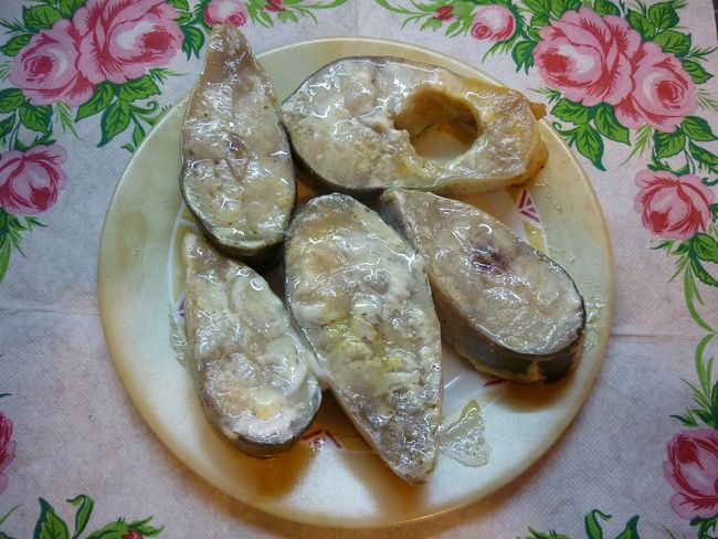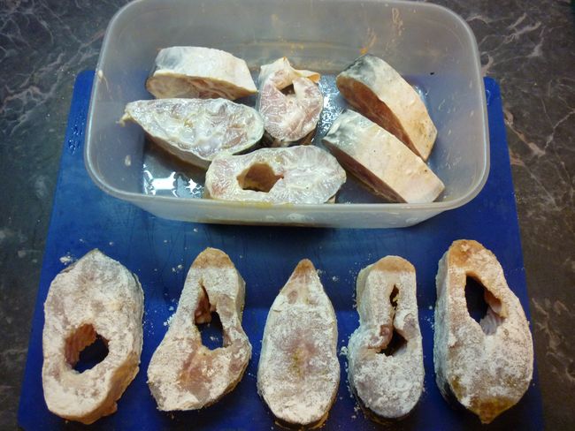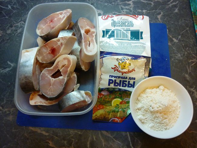 Для жарки – обваливаем куски рыбы в муке, для приготовления на пару обмазываем майонезом.