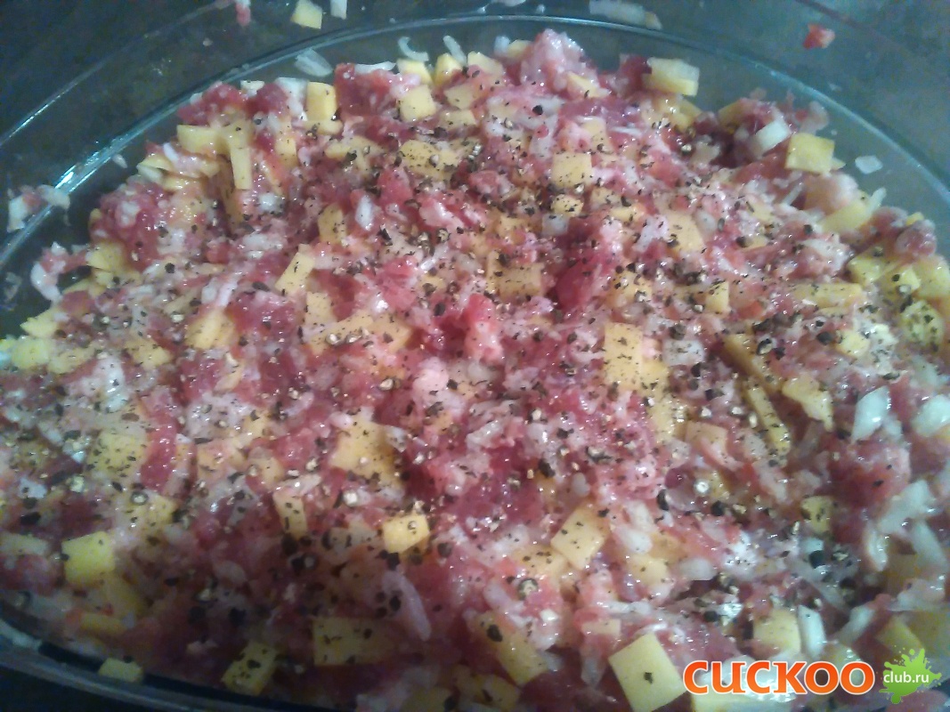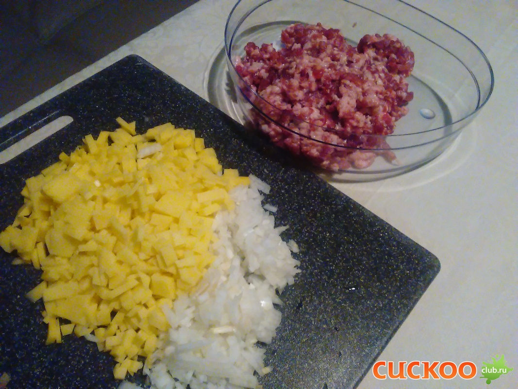 Утку по рецепту надо порезать на мелкие кусочки( я прокрутила на мясорубке с крупной решеткой), лук режем мелко, картофель кубиками или соломкой. Смешиваем,солим, перчим.