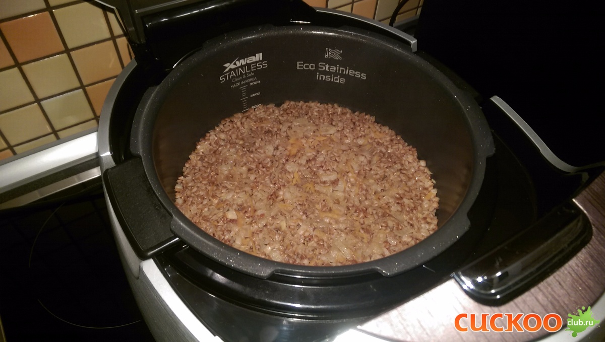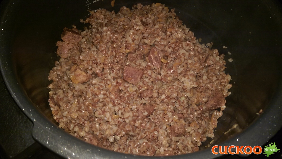 Мои дополнения: гречки всегда беру 2 м.ст, воды соответственно 6 м.ст. , т.к. в той пропорции, что предлагается по книге мяса ИМХО многовато.