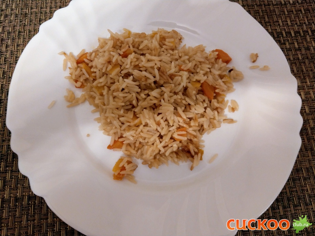 на режиме Поджарка 10 минут 3 уровень при открытой крышке обжарить овощи, добавить рис, воду, посолить, перемешать.