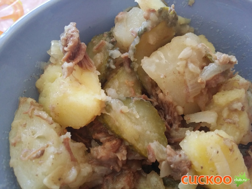 Готовила так: картошку поставила отвариваться ( мцльтиповар 15 мин, 100° С) В это время спассировала лук на тушеночном жире, а потом и саму тушенку добавила к луку. Порезала маринованные огурчики и в конце бросила к тушенке с луком. Картошка отварилась, воду слить и перемешать с тушенкой. Я съела двойную порцию