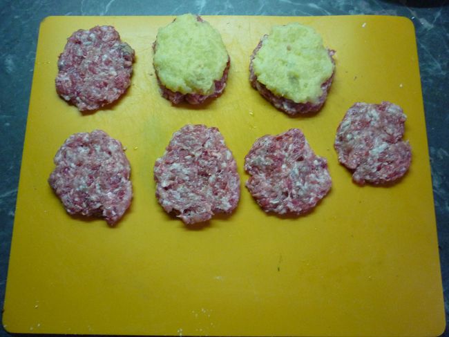 Фарш солим, добавляем перец и все тщательно перемешиваем. Из фарша готовим шарики, затем придавливаем их, что бы получилась лепешка. То же самое проводим с картофельным пюре и выкладываем их на фарш. Края подравниваем и формируем котлетки.