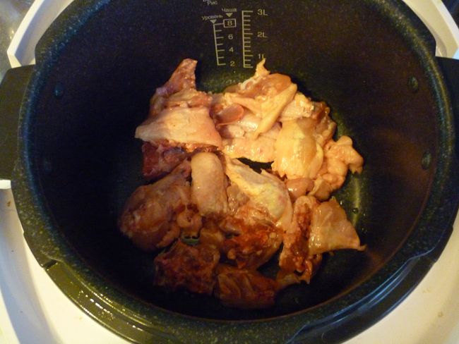 В чашу мультиварки налить масло, повернуть ручку в положение “Закрыто” и выбрать программу “Поджарка”. Установить время 18-20 минут и второй уровень температуры. Выложить в чашу куски курицы и нажать кнопку “Старт”.
