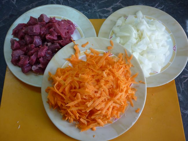 Мясо моем и нарезаем небольшими кусочками, морковь трем на крупной терке, лук мелко режем.
