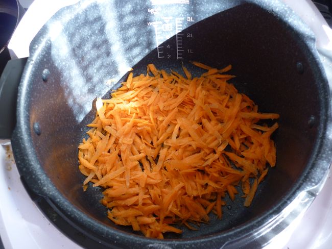 В чашу мультиварки наливаем растительного масла, поворачиваем ручку в положение “Закрыто” и выбираем программу “Поджарка”. Устанавливаем время 10 – 15 минут и второй уровень температуры. Нажимаем кнопку “Старт” и выкладываем морковь.