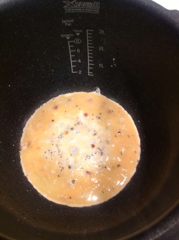 Получилось 4 бризоли. Для каждой порции я взбивала по 1 яйцу отдельно, чтобы не ошибиться. Включить режим поджарка на 35 мин. 2 уровень. Смазать дно маслом, совсем чуть-чуть. Во взбитое яйцо добавить соль и немного специй для мяса. Вылить это тонким слоем на дно кастрюльки, получится как блин из яйца.