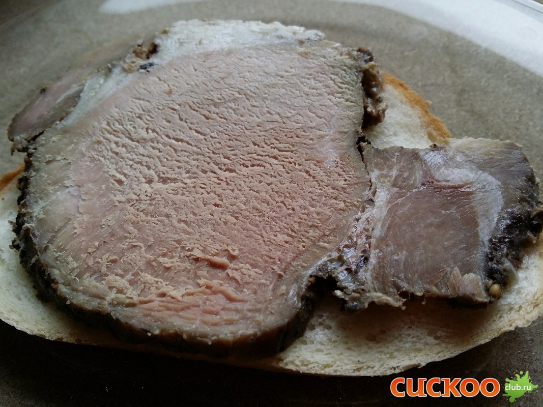 После всего этого помещаем наше мяско в кастрюльку нашей кукушечки, наливаем кипяток до отметки 2, правая шкала, включаем режим РР на 2 ч. 40 минут. Все, по окончание времени приготовления извлечь наше мяско из пакетов, дать остыть, завернуть в фольгу и убрать в холодильник до полного остывания. Все. Можно достать из холодильника, освободить от сетки, тоненько нарезать и употребить на завтрак…. Ммммммм, очень вкусно. Я частенько делаю так мясо в дорогу… Угощайтесь мои дорогие… s24