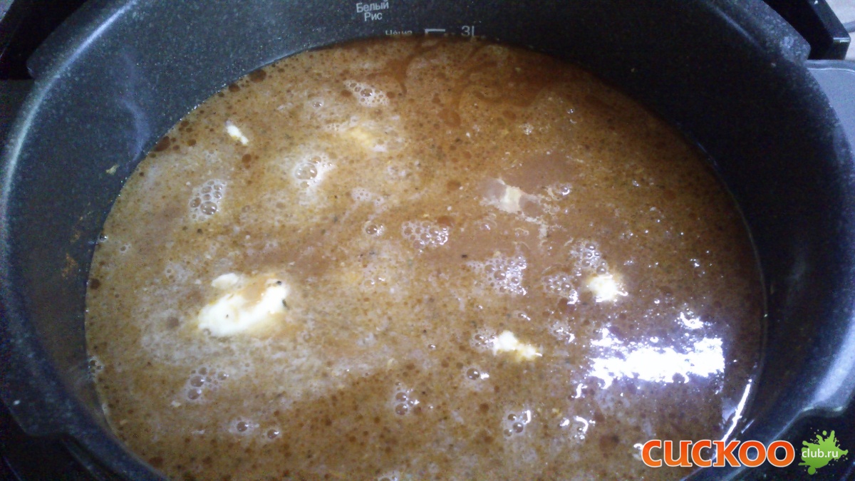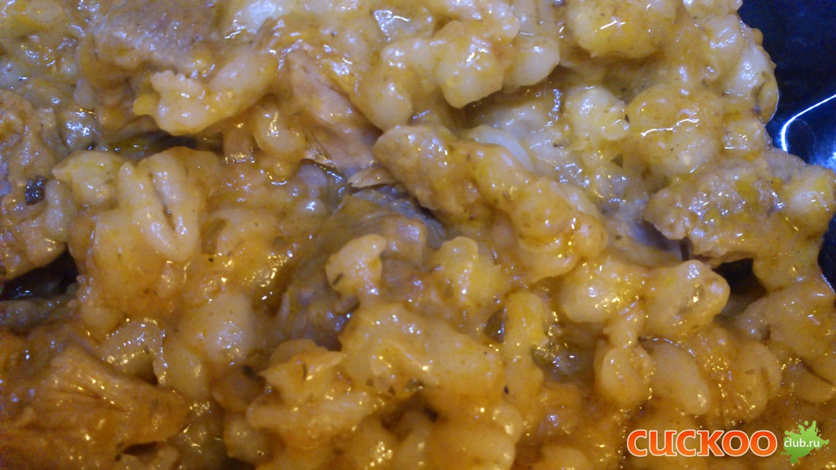 Помня про частенько суховатые духовочные варианты, не жалеючи кинула сливочного масла h1 ( Зря, потому что в итоге блюдо получилось ну очень жирным. Наверно, потому что в кукушке, в отличие от духовки, жиру некуда испаряться и весь он и остается в блюде, об этом я не подумала. Тут надо либо зажарку делать без масла, либо сливочного добавить совсем немножко) Короче, по окончании приготовления (РР 2 часа) получилось вот что: