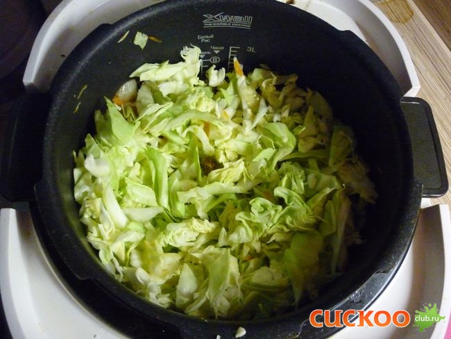 Еще через 5-6 минут добавляем капусту, все перемешиваем, подсаливаем. При желании можно добавить специи.