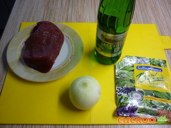 Складываем мясо в отдельную посуду, кладем лук и заливаем все минеральной водой.