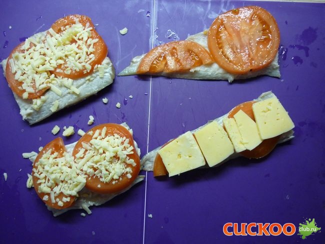 Сверху выкладываем помидор и посыпаем тертым сыром. Можно брать и кусочки сыра.