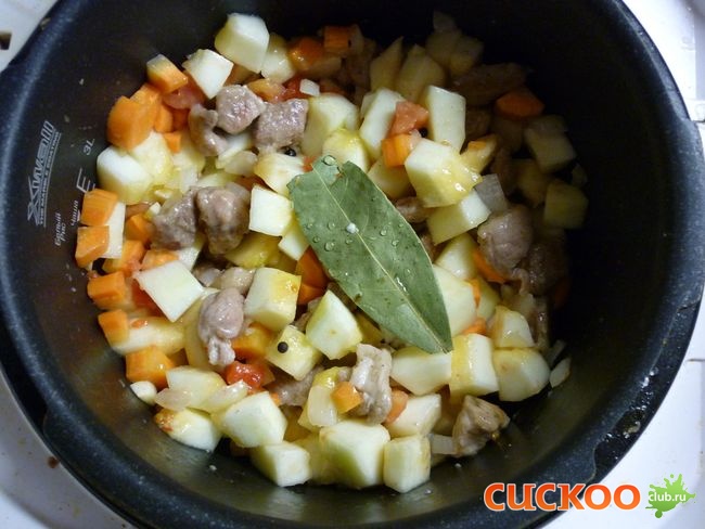 После сигнала добавляем кабачки, морковь, помидоры, томатную пасту, лавровый лист, перец горошком, солим.