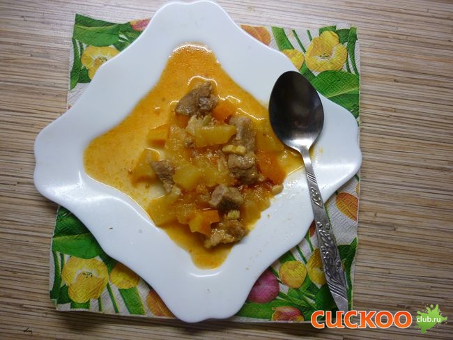 Нажимаем кнопку “Старт”. Периодически помешиваем. Через 5 минут добавляем лук и продолжаем готовить.