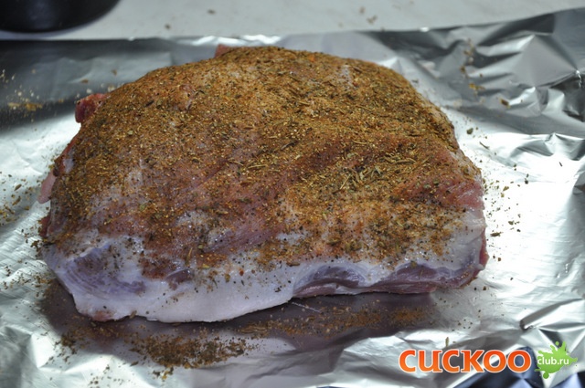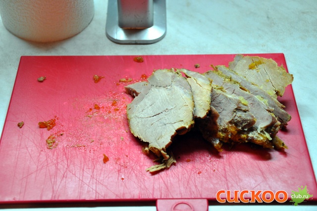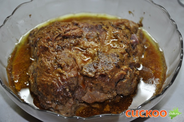 Кусок свинины был 1250, замариновала его вчера в приправе к шашлыку (вместо приправы к свинине в мясной лавке всунули f3 , проглядела) и обмазала горчицей, все в фольгу и в холодильник,вот что вышло.