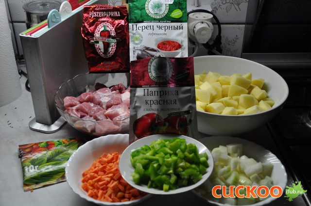 1 кг говядины без костей, 80 г свиного жира, 300 г лука, 20 г паприки, соль, тмин, чеснок, 1 кг картофеля, 140 г зеленого перца, 60 г свежих помидоров, 6 порций чипетке