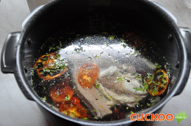 Грудинку кладем в кастрюлю и варим на плите до закипания+ еще минут 5-7, выключаем комфорку.