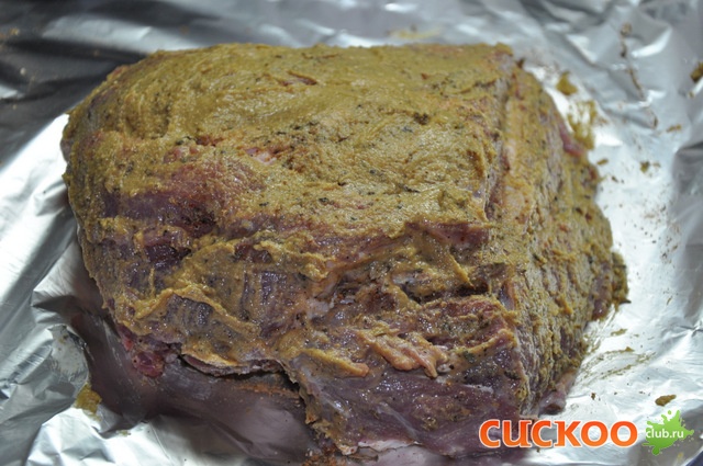Кусок свинины был 1250, замариновала его вчера в приправе к шашлыку (вместо приправы к свинине в мясной лавке всунули f3 , проглядела) и обмазала горчицей, все в фольгу и в холодильник,вот что вышло.