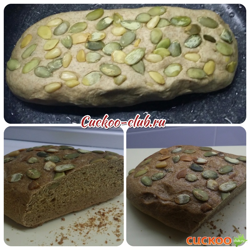 Тесто мне замесила ХП. Далее я оформила буханочку. На стол насыпала семечек и орешки. Сверху положила буханку и немного прокатила, чтобы семечки прилипли. Далее в чашу мультиварки. Программа ВЫПЕЧКА 50 МИН, 2 УРОВЕНЬ.
