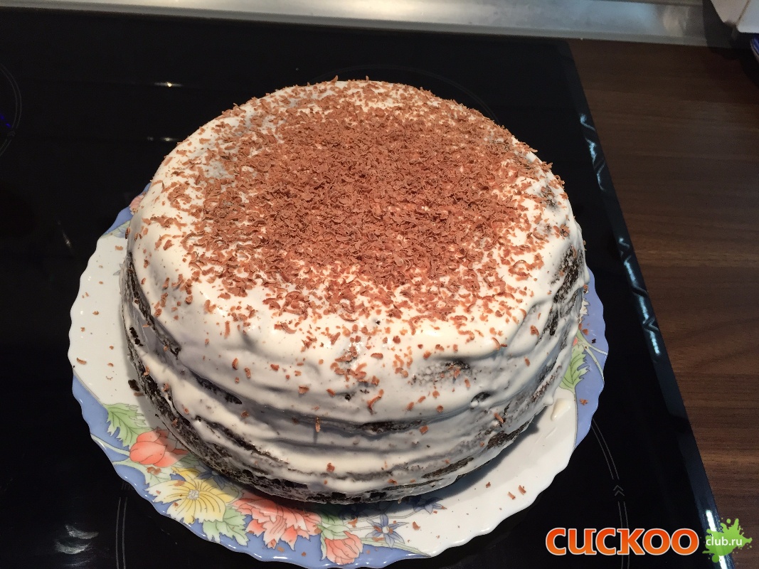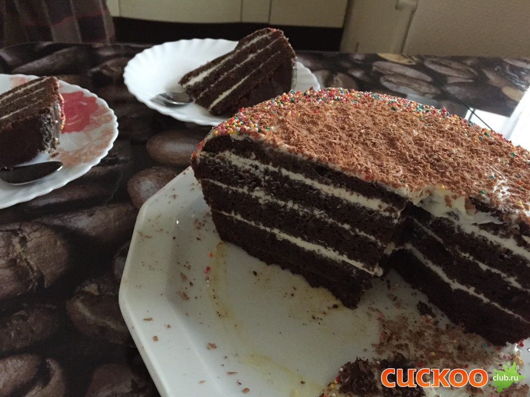 Взбить яйца с сахаром в пену.Добавить половину газированной воды (100 мл)- не перемешивать! Добавляем муку и начинаем вымешивать тесто лопаточкой ( не взбиваем) . Погасить соду в соке половинки лимона и вмешать в тесто. Постепенно добавляем оставшуюся газированную воду , регулируя степень густоты теста (до консистенции жирной сметаны). Дать массе постоять 10 минут. Чашу мультиварки смазать сливочным маслом и выпекать на программе Духовка 1 уровень 40-45 мин. Готовый бисквит разрезать на 4 части, уложить стопкой пористой частью вверх (кроме верхнего коржа), промазав слои кремом. Сверху можно посыпать торт тертым шоколадом. s35