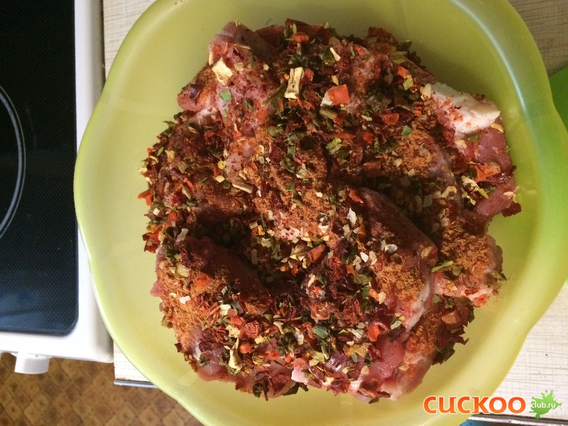 Пока Флагман трудился над суфлешкой из творога, рёбрышки мариновались часик в приправе "сочные рёбрышки" и ещё сухих овощей добавила.