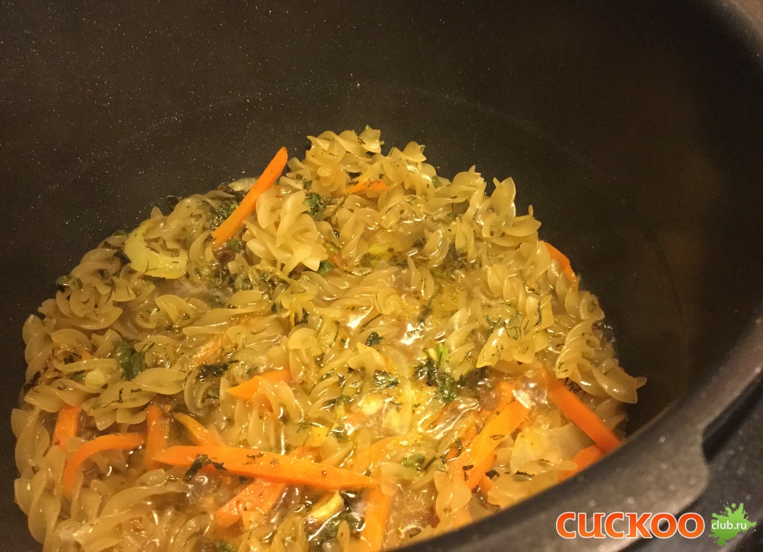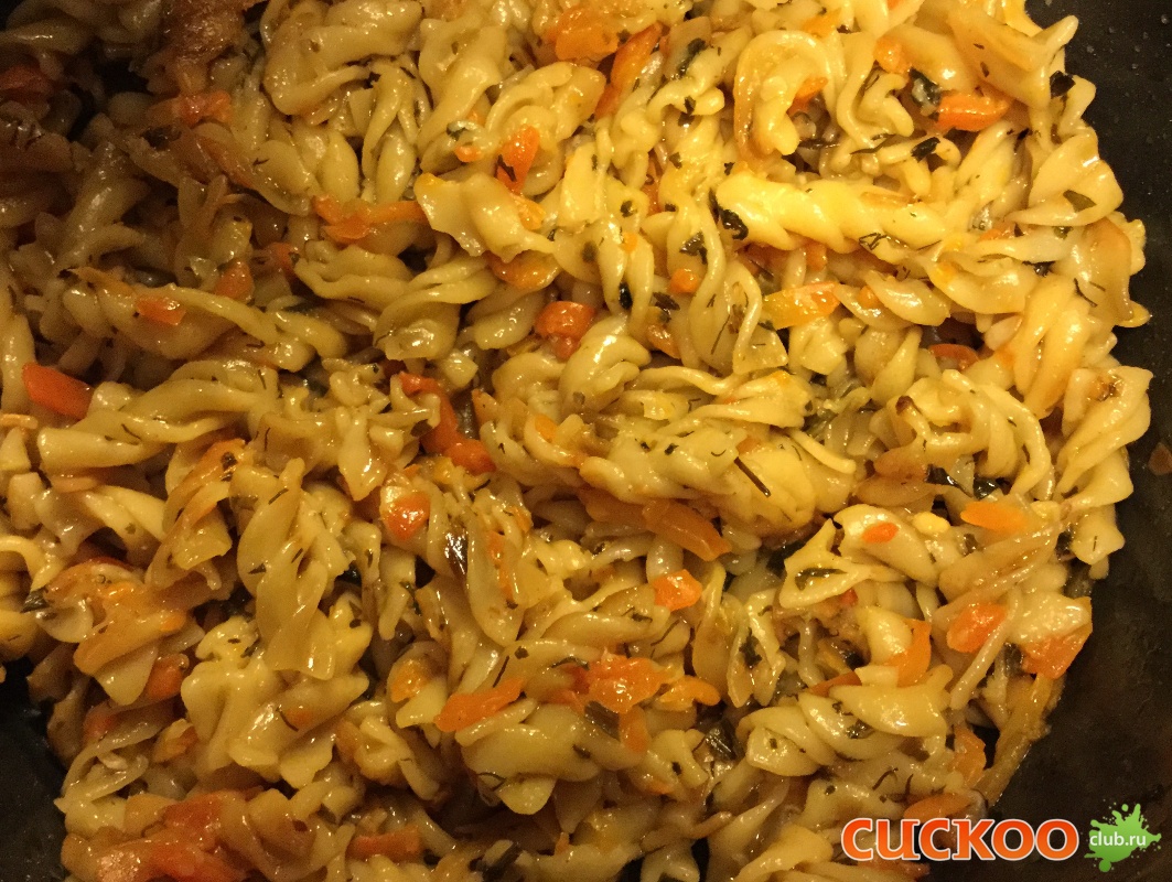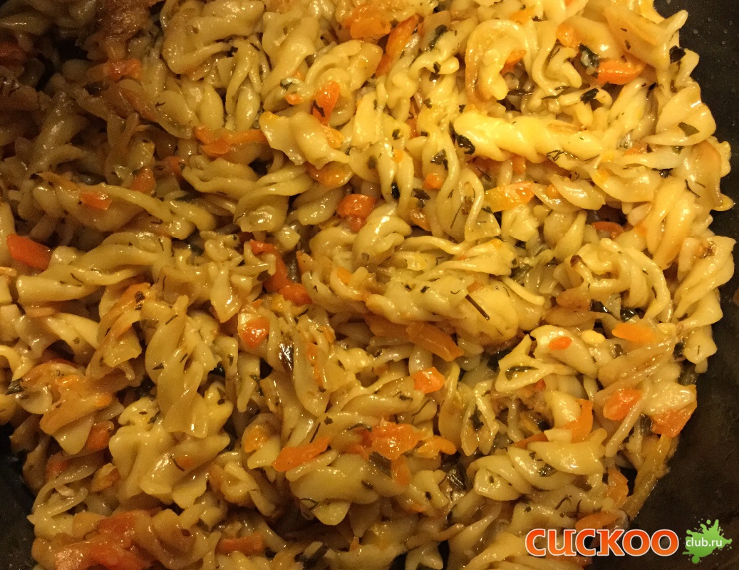 к обжаренным овощам добавить макароны, залить кипятком,только чтобы покрыть макароны....